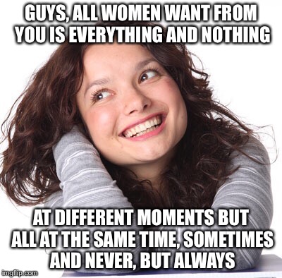 I defy any of you to find a woman who does not fit one of these memes and I’ll prove to you that she has you fooled. Like men, women are not complex creatures we all want the same thing and we use passive aggressive methods to get them. You may be strong and smart, but we are crafty as well as smart it’s a skill we’ve honed to make up for our lack of physical strength…even the dumb ones are cunning. It’s nature’s way of finding balance. Enjoy the ten memes that perfectly describe women in a relationship!