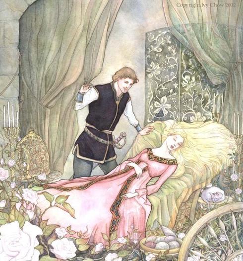 Anyway, the Princess pricks her finger, falls into a deep sleep, and caused the deaths of many princes who attempted to break into the thorn-covered castle in an attempt to rescue her. Finally, one Prince was allowed into the castle by the thorns, and he awakened Sleeping Beauty and indeed the entire kingdom by simply kissing her. They then got married and lived happily ever after.