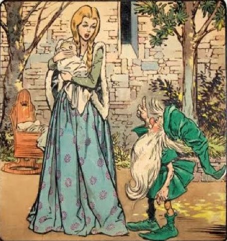 One year after their marriage, she had a child. Rumpelstilskin came to collect what he was promised. The Queen couldn’t even think of giving up her child, and instead offered the little man all of the riches in the kingdom, which he refused. Instead of taking the child, he made the Queen a deal, if she could guess his name in three days, she could keep her child. Eventually she did guess his name, and he became so enraged that “he plunged his right foot so deep into the earth that his whole leg went in; and then in rage he pulled at his left leg so hard with both hands that he tore himself in two.”